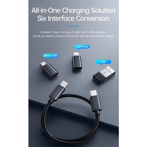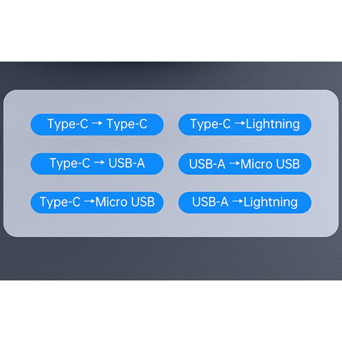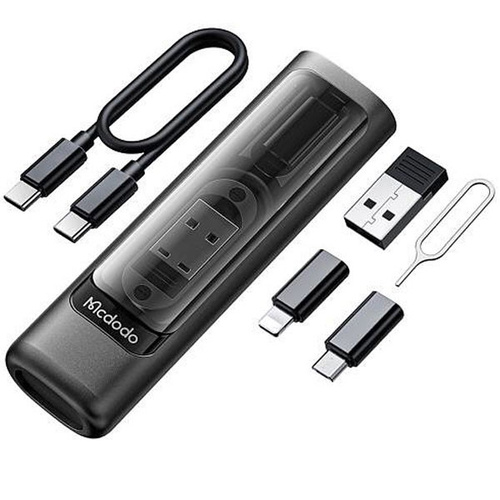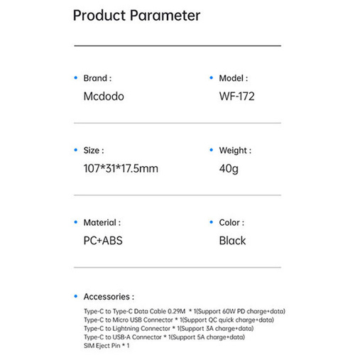 امروزه گوشی های موبایل، تبلت ها و لپ تاپ ها دارای یکی از سه پورت شارژ لایتنینگ ، میکرو یو اس بی و تایپ سی هستند که شما برای شارژ هر کدام از این دستگاه ها که دارای پورت مخصوص به خود می باشد، باید کابل مخصوص آن را نیز با خود داشته باشید. کمپانی Mcdodo با ساخت پک کابل چند منظوره Mcdodo WF-1720 باعث شده تا شما بتوانید با به همراه داشتن این باکس امکان شارژ هر سه نوع درگاه برای شما وجود داشته باشد. این کابل دارای کانکتور های Lightning ، Type-C و Micro USB بوده و به شما این امکان را می دهد تا هر نوع گوشی را شارژ کنید. مشخصات پک کابل چند منظوره Mcdodo WF-1720 باکس چند منظوره WF-1720 دارای 107x31x17.5 میلی متر بوده و وزنی حدود 40 گرم دارد که به راحتی می توانید آن را حمل و نقل کنید. جنس این محصول از پلاستیک محکم ABS و PC بوده که در برابر گرما نیز مقاوم است. داخل باکس چند منظوره WF-1720 یک کابل تایپ سی به تایپ سی با طول 30 سانتی متر، یک تبدیل لایتنینگ (آیفونی)، یک تبدیل USB، یک تبدیل میکرو (Micro USB) و یک سوزن سیم کارت وجود دارد. قابل ذکر است تبدیل ها به کانکتور تایپ سی متصل خواهند شد. شما با استفاده از این تبدیل ها و کابل می توانید تمام دستگاه های موجود را به سیستم و یا آداپتور خود متصل کرده و به انتقال اطلاعات و یا شارژ بپردازید. شما می توانید در 6 حالت از این کابل و تبدیلها استفاده کنید.بعلاوه محفظهای برای قرار دادن سیم کارت و کارت حافظه (TF) در داخل این باکس طراحی شده که باعث میشود شما بتوانید سیم کارت و مموری کارت خود را داخل این باکس گذاشته و با خود حمل کنید. شارژ سریع PD پک کابل چند منظوره Mcdodo WF-1720 دارای قابلیت شارژ سریع PD بوده که می توانید دستگاه های خود را با سرعت بالا شارژ کنید. توان کلی این کابل 60 وات می باشد. قابل ذکر بوده برای استفاده از این توان، نیاز است دستگاه شما این توان را پشتیبانی کند (کابل تایپ سی به تایپ سی). این کابل از فناوری های شارژ سریع SCP، AFC، OPPO، VOOC، VIVO، QC2.0، QC3.0، QC4.0 و PD پشتیبانی می کند و می توانید دستگاههای که از این تکنولوژیها پشتیبانی می کنند، را سریع شارژ کنید.
