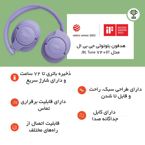 هدفون JBL Tune 720BT صدا قدرتمند JBL Pure Bass کمپانی جی بی ال را به لطف آخرین فناوری بلوتوث نسخه 5.3 عرضه کرده است. این هدفون تا 76 ساعت لذت گوشدادن به موسیقی و 3 ساعت باتری اضافی تنها با 5 دقیقه شارژ را ارائه میدهد. JBL Tune 720BT وزنی برابر با 220 گرم دارد، این وزن کمتر از میانگین وزن هدفونها برای راحتی در استفاده طولانی مدت است و بسیار عالی است. جی بی ال جابجایی راحت را در هدفونهای جدید خود مدنظر دارد. هدفون دارای پدهای بزرگی هست که در اطراف کل گوش شما قرار میگیرند. این طرح به دلیل افزایش عایق صدا و اینکه صدا به اطرافیان شما نشت نکند موردعلاقه است.JBL Tune 720BT دارای بلندگوهای استریو است، دستگاههای دارای بلندگوهای استریو صدا را از کانالهای مستقل در هر دو سمت، چپ و راست پخش میکنند و صدای غنیتر و تجربه شنیداری بهتری را ایجاد میکنند.