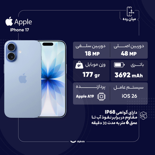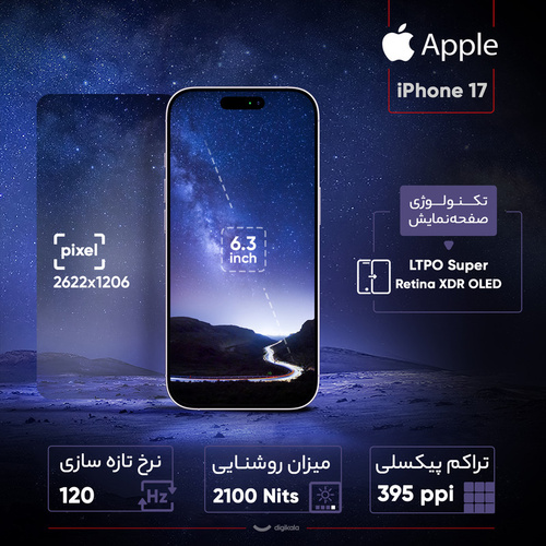 آیفون 17 تازهترین پرچمدار اپل است که با ترکیب طراحی زیبا، نمایشگر ارتقایافته و سختافزار قوی، تجربهای کاملتر از همیشه را ارائه میدهد. اپل با باریکتر کردن حاشیهها، نمایشگر 6.3 اینچی Super Retina XDR LTPO OLED را در بدنهای جمعوجور جای داده است. این نمایشگر نرخ نوسازی تطبیقی 120 هرتز، روشنایی خیرهکننده 3000 نیت و پوشش ضدانعکاس دارد و حتی در زیر نور مستقیم خورشید مشکلی برای تماشای محتوای صفحه نمایش نخواهید داشت. قابلیت Always-On Display نیز برای نخستینبار در نسخه غیر Pro در دسترس کاربران قرار گرفته است. در بخش طراحی، اپل از آلومینیوم بازیافتی و پوشش مقاوم Ceramic Shield 2 استفاده کرده که نسبت به نسل قبل سه برابر مقاومت بیشتری دارد. این گوشی در پنج رنگ جذاب عرضه میشود و با وزن مناسب، کاربری روزمره را آسان میسازد. دوربینهای دوگانه 48 مگاپیکسلی آیفون 17 شامل لنز عریض و فوقعریض ارتقایافتهاند که جزئیات خیرهکننده، دامنه داینامیکی وسیع و قابلیت عکاسی ماکرو را ارائه میدهند. فیلمبرداری 4K با Dolby Vision و حالتهای Cinematic و Action Mode آن را به ابزاری حرفهای برای تولید محتوا تبدیل کرده است. دوربین سلفی نیز با سنسور جدید و قابلیت Center Stage به سطحی تازه ارتقا یافته است. قلب تپنده دستگاه، تراشه 3 نانومتری A19 است که با قدرت پردازشی بالا، پشتیبانی از Ray Tracing و رم 8 گیگابایتی، تجربهای سریع و روان را تضمین میکند. عمر باتری تا 30 ساعت پخش ویدئو ادامه دارد و با شارژ سریع، تنها در 20 دقیقه به 50 درصد میرسد. پشتیبانی از شارژ بیسیم MagSafe و استاندارد Qi2 هم در دسترس است. در نهایت آیفون 17 انتخابی ایدهآل برای کاربرانی است که به دنبال نمایشگری درخشان، دوربینهای قدرتمند، پردازنده سریع و نرمافزاری هوشمند هستند؛ گوشیای که یکی از کاملترین پرچمداران سال 2025 لقب گرفته است.